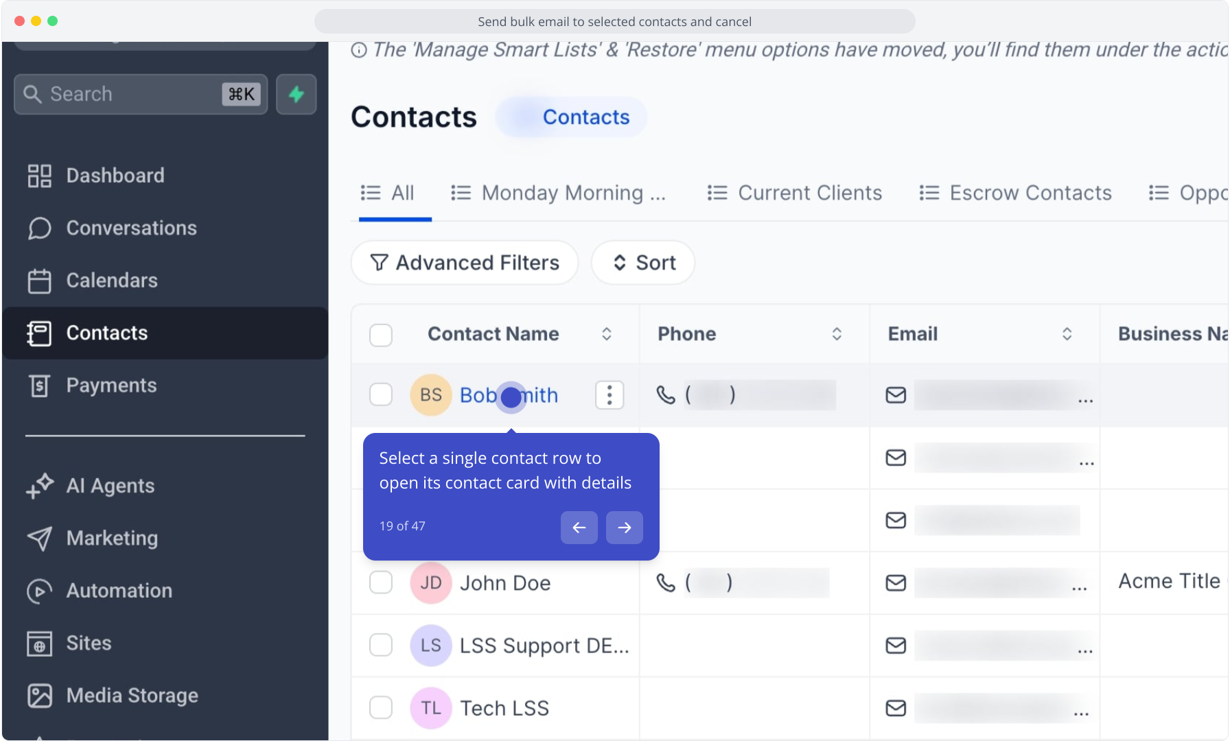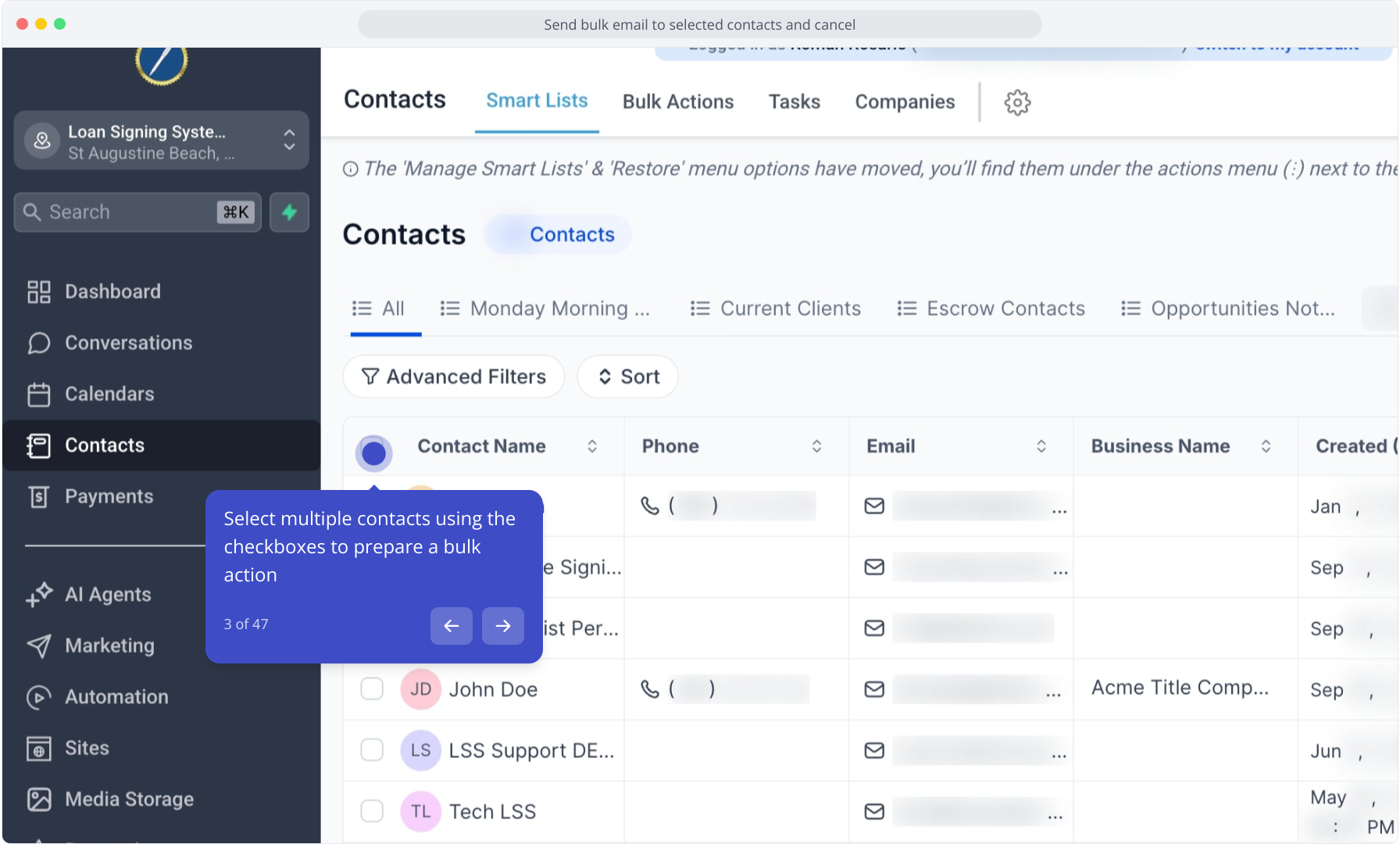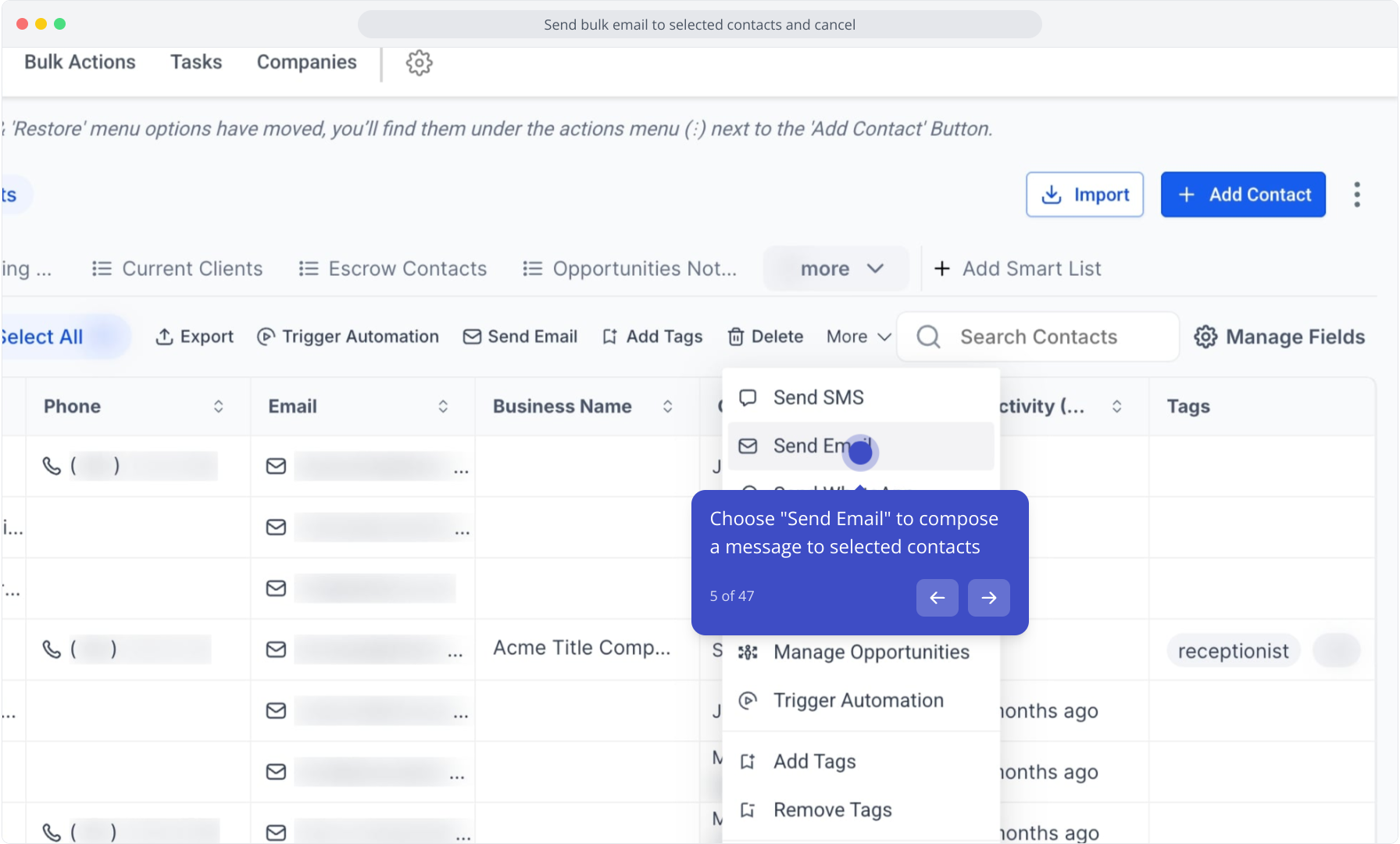 3. Select multiple contacts using the checkboxes to prepare a bulk action