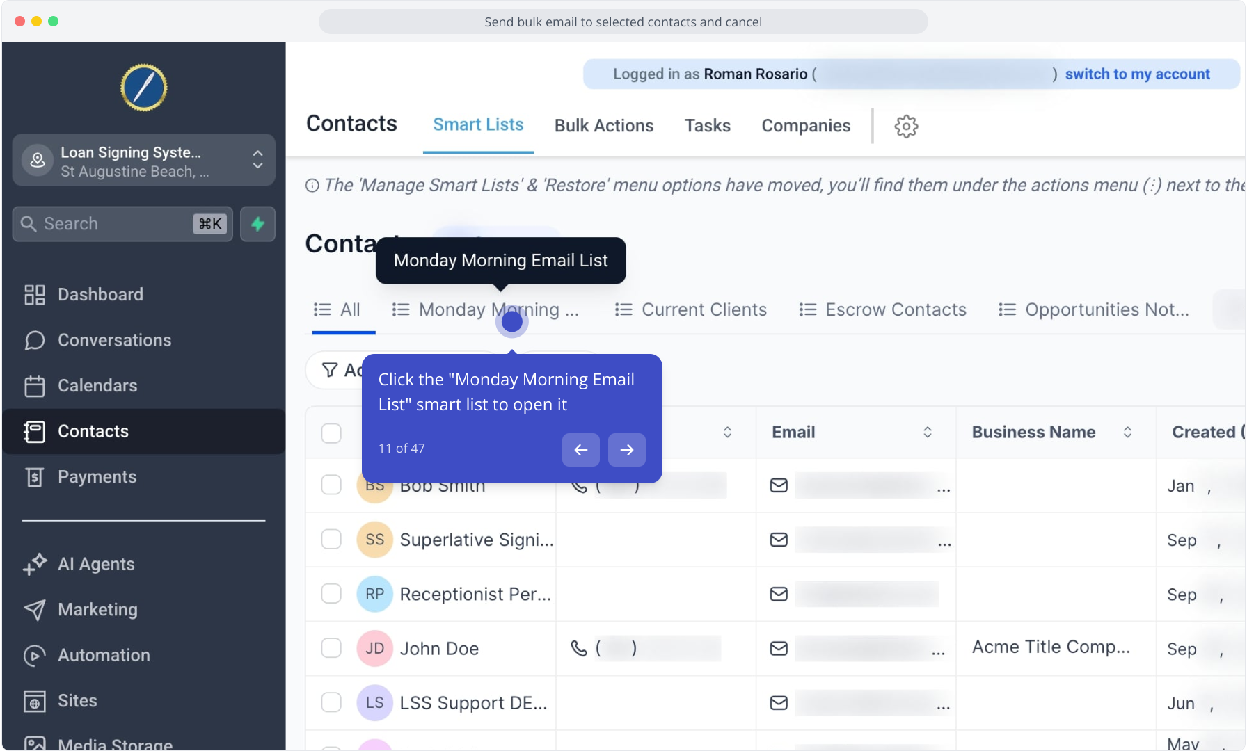 11. Click the "Monday Morning Email List" smart list to open it