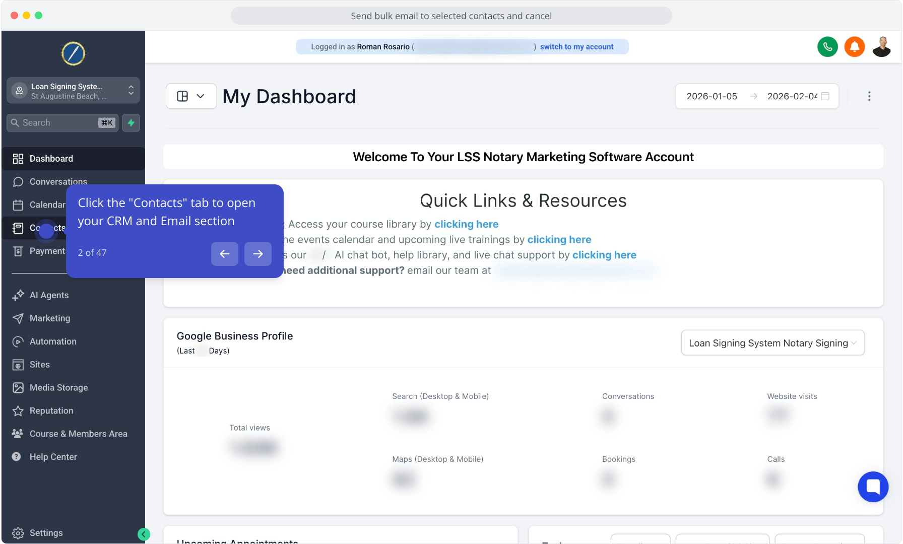 2. Click the "Contacts" tab to open your CRM and Email section
