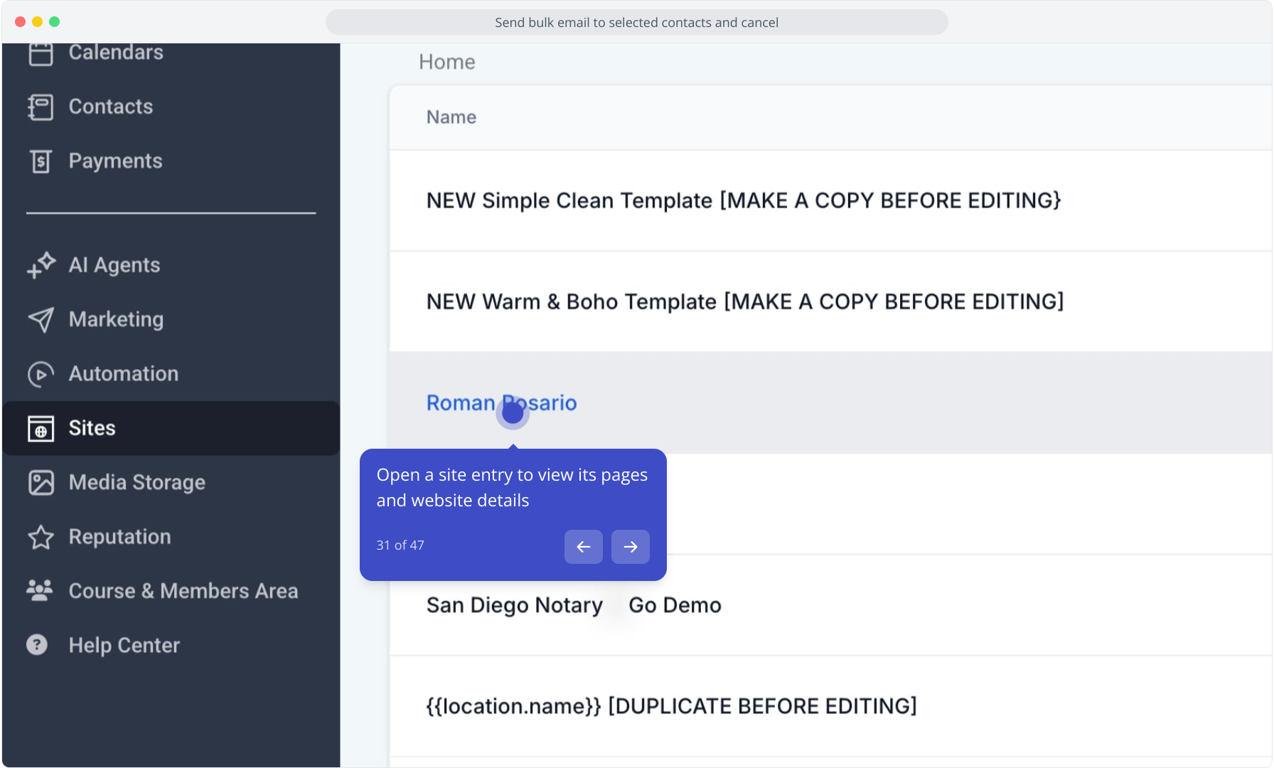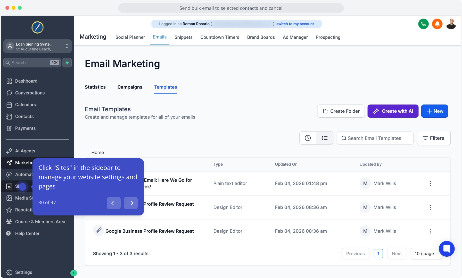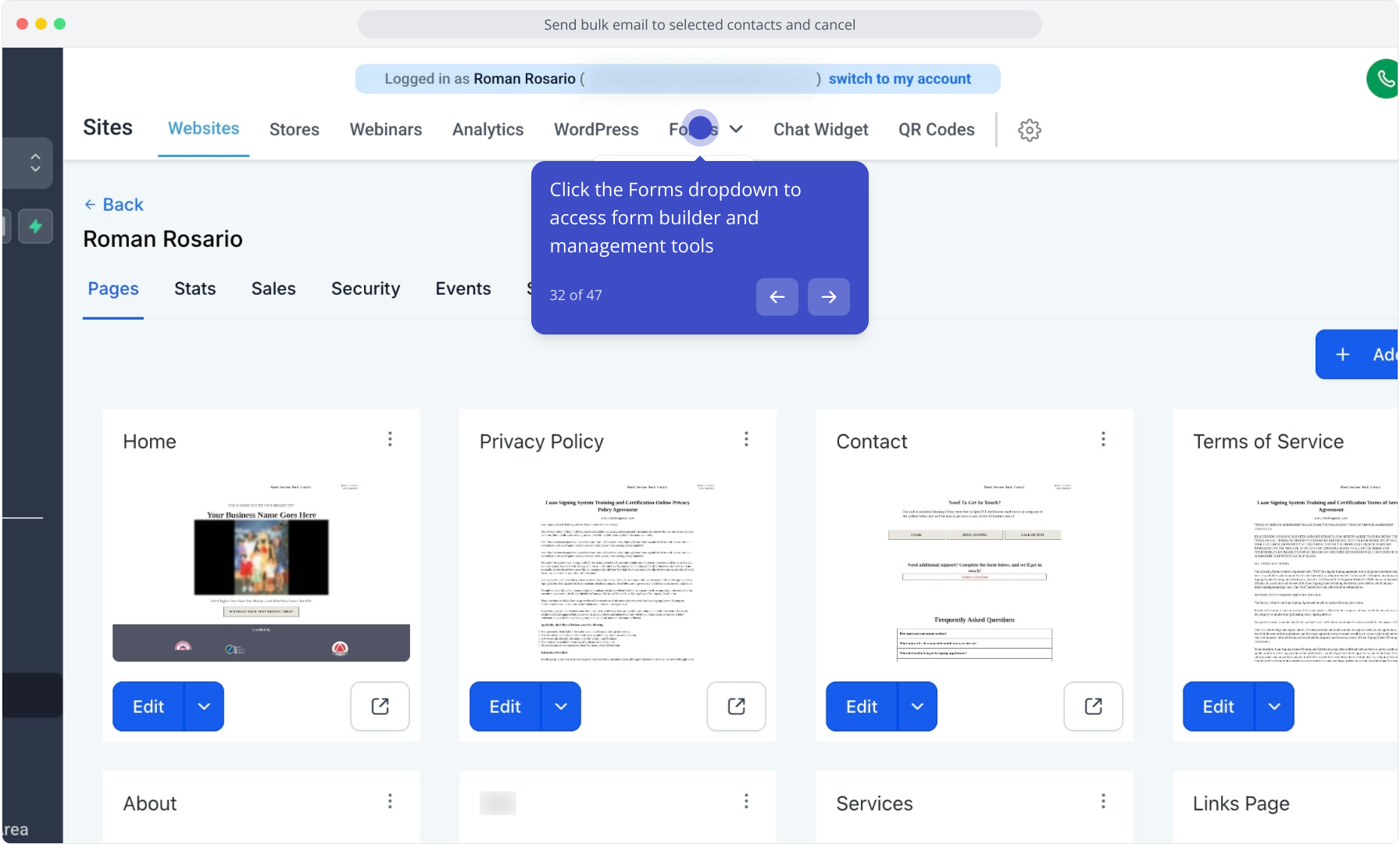 30. Click "Sites" in the sidebar to manage your website settings and pages