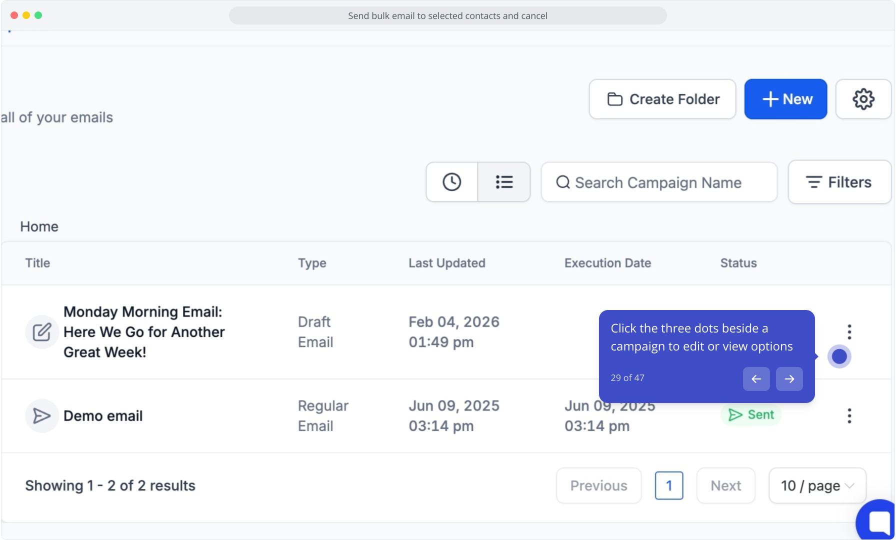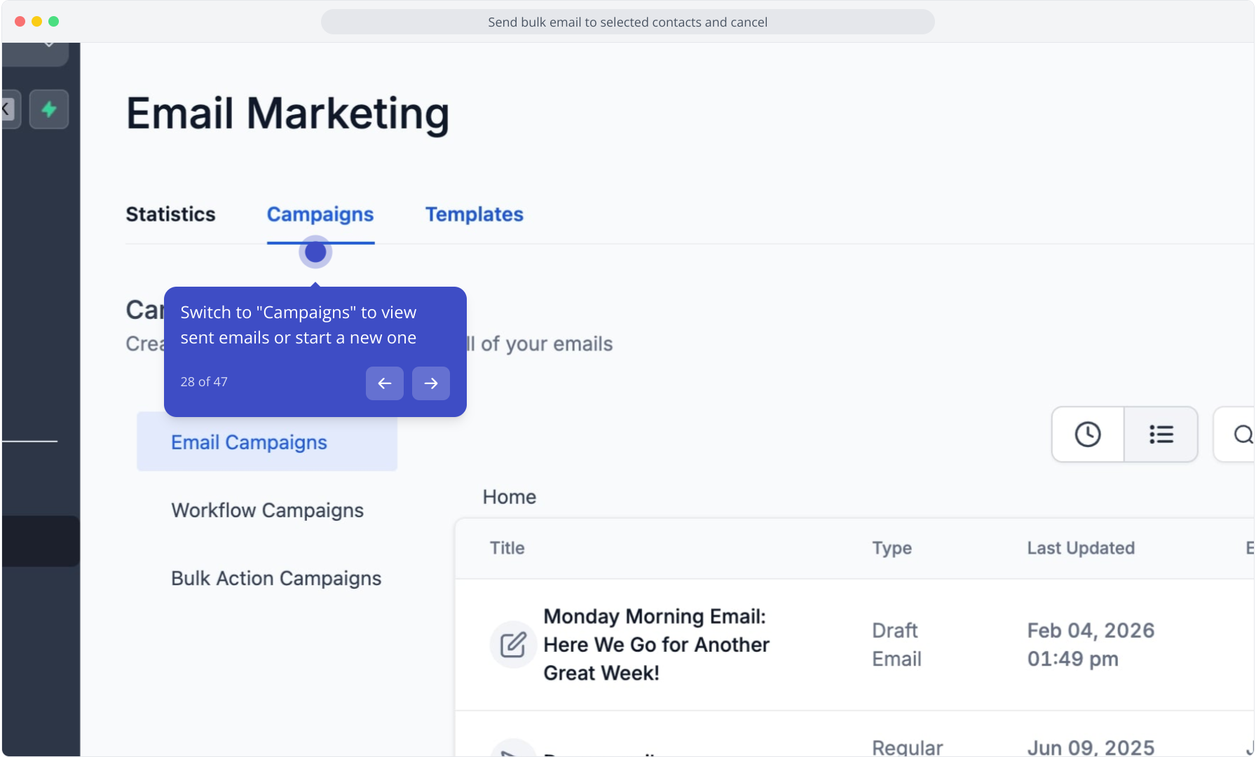 28. Switch to "Campaigns" to view sent emails or start a new one
