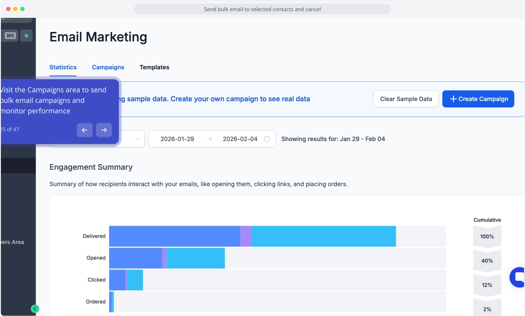 25. Visit the Campaigns area to send bulk email campaigns and monitor performance