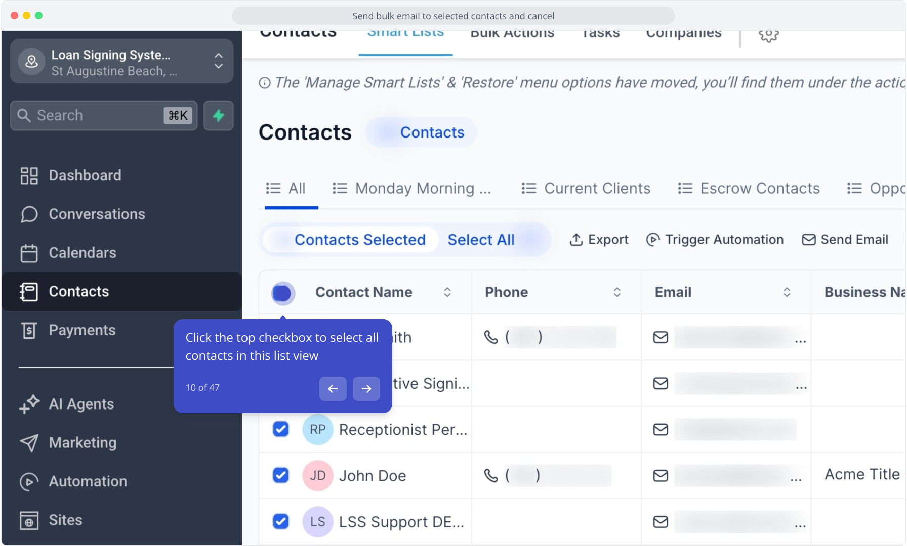 10. Click the top checkbox to select all contacts in this list view