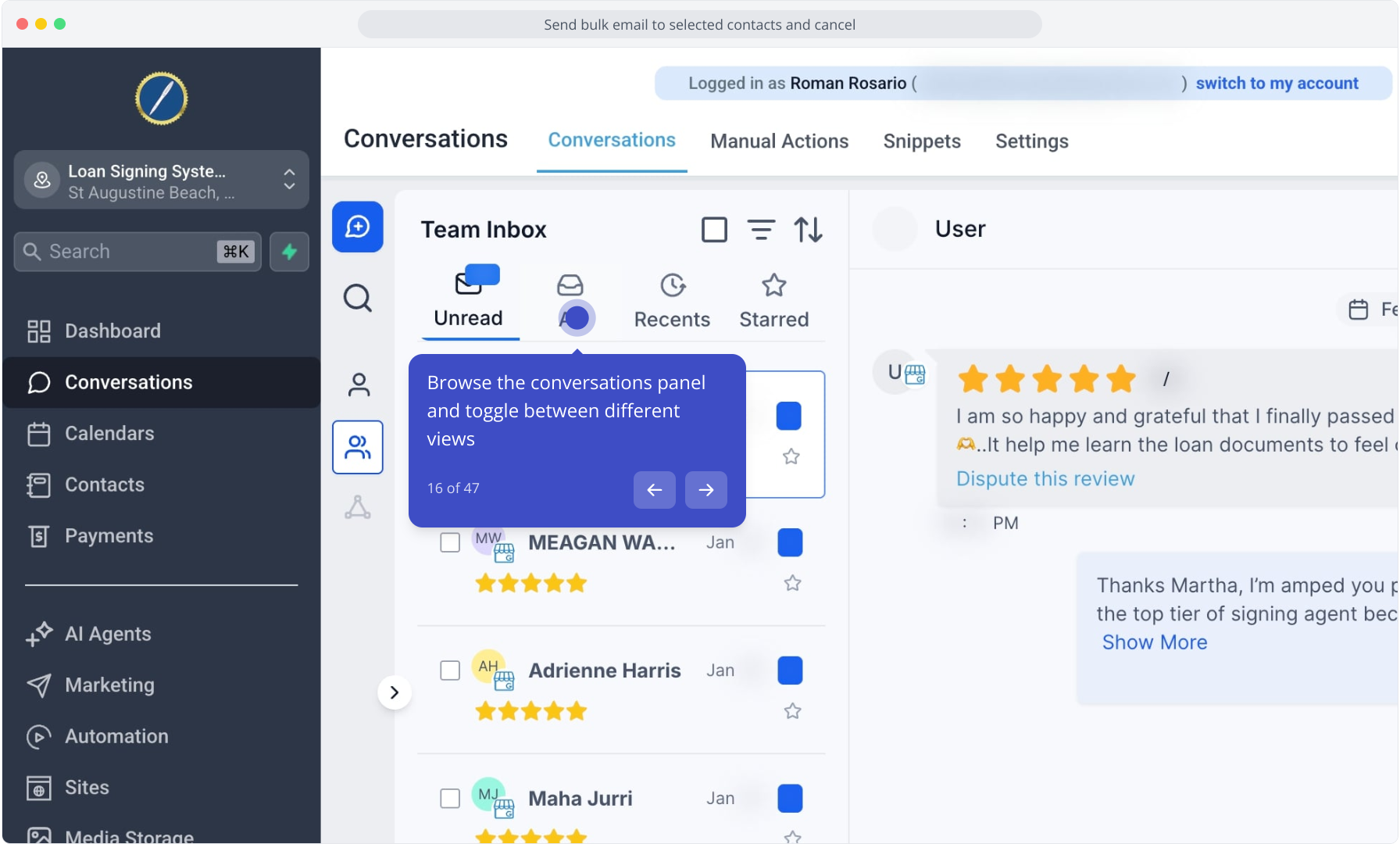 16. Browse the conversations panel and toggle between different views
