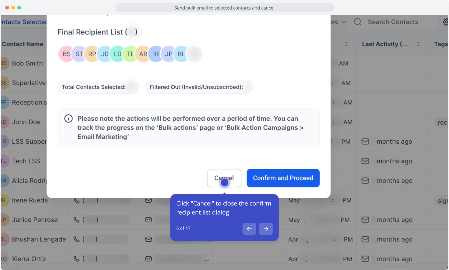 6. Click "Cancel" to close the confirm recipient list dialog